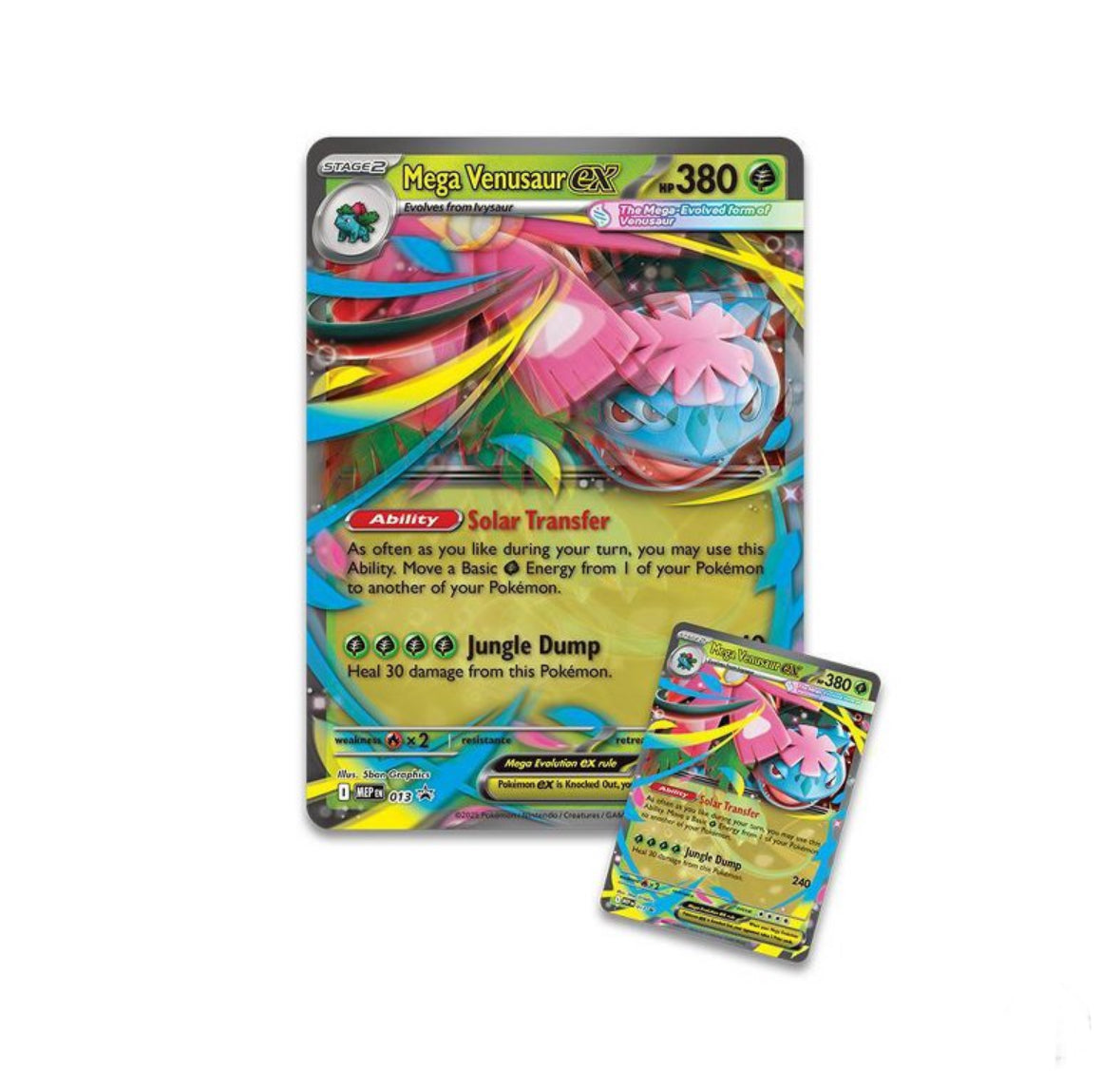 as you please, ensuring you’re always ready to attack. In this collection, you get a playable foil promo card and an oversize lenticular promo card featuring Mega Venusaur ex, along with a tech sticker for decorating devices, binders, and notebooks. You’ll find even more Pokémon inside a stack of Pokémon TCG booster packs
